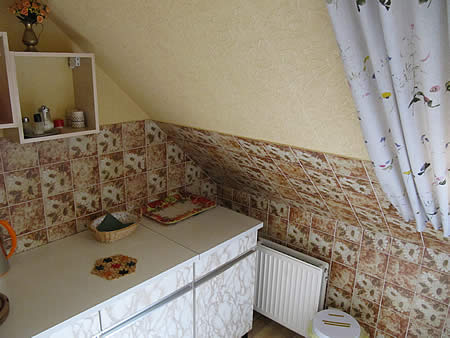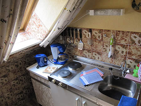 - Küche mit Doppelkochplatte, Kühlschrank/Gefrierfach, Mikrowelle, Kaffeemaschine, Wasserkocher