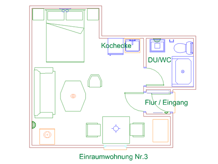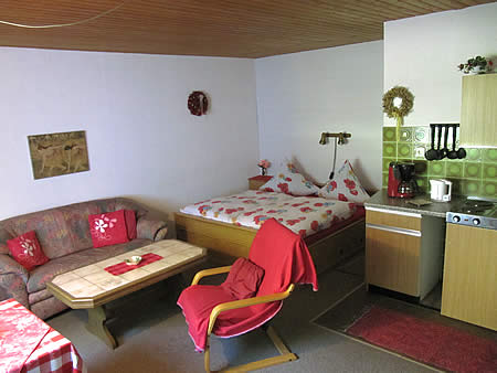 - Diese Einraunwohnung (27 m²) verfügt über ein Doppelbett mit verstellbaren Lattenrosten,