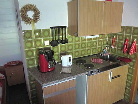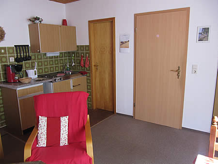 Polster-Sitzecke, Esstisch, TV-Gerät, WLAN-Internet - Küchenzeile mit Doppelkochplatten, Kühlschrank mit Gefrierfach, Kaffeemaschine, Wasserkocher