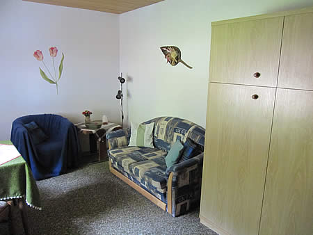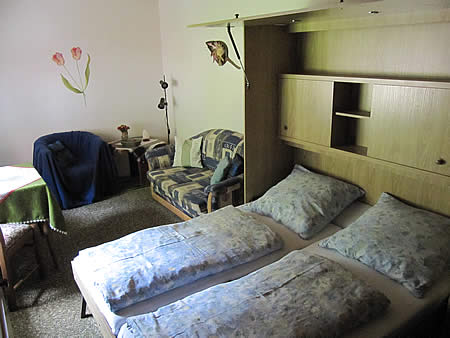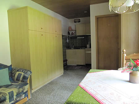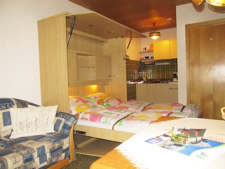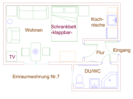 - Diese Einraumwohnung (25 m²) verfügt über ein Schrankbett (Doppelbett 2,00 m x 1,6 m) Polster-Sitzecke, Esstisch, TV-Gerät, WLAN-Internet